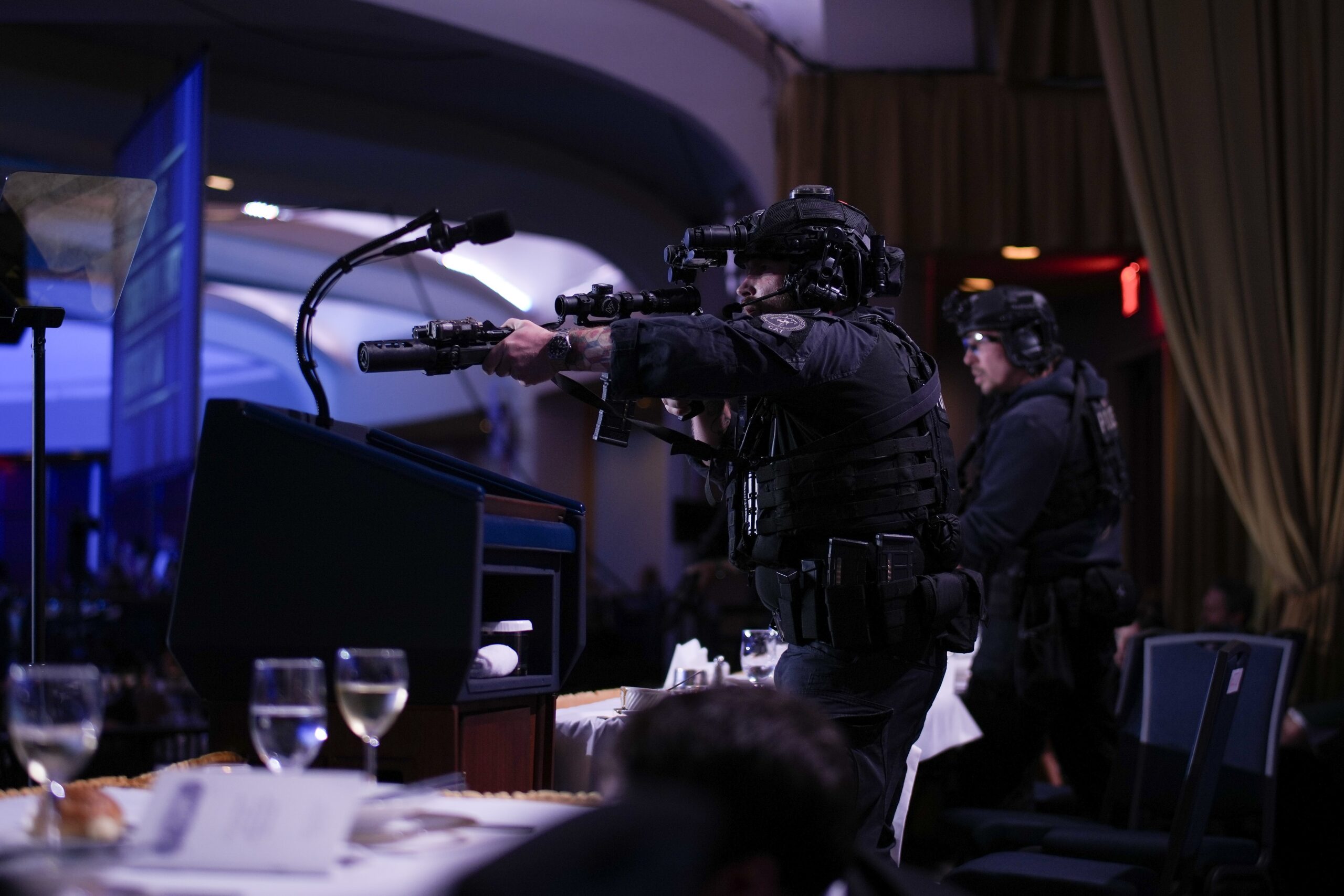 Agents stand guard after the shooting at the annual White House Correspondents Association Dinner on Saturday. Andrew Harnik/Getty Images